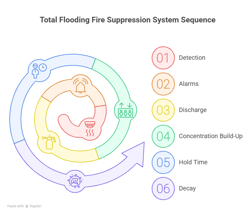 A system designed as a total flooding fire suppression system relies on the enclosure holding the agent concentration long enough to prevent re‑ignition.